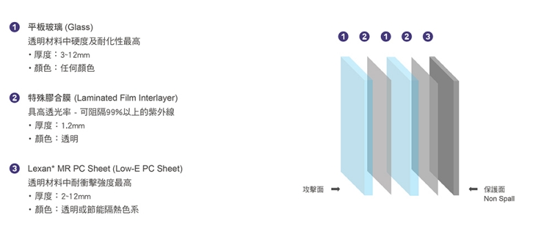 採用多層耐衝擊透明聚碳酸酯板材(Polycarbonate) 和特殊玻璃,經過高溫高壓膠合而成,具有高強度耐衝擊能力的防彈透明材料。